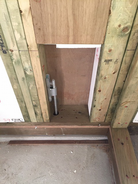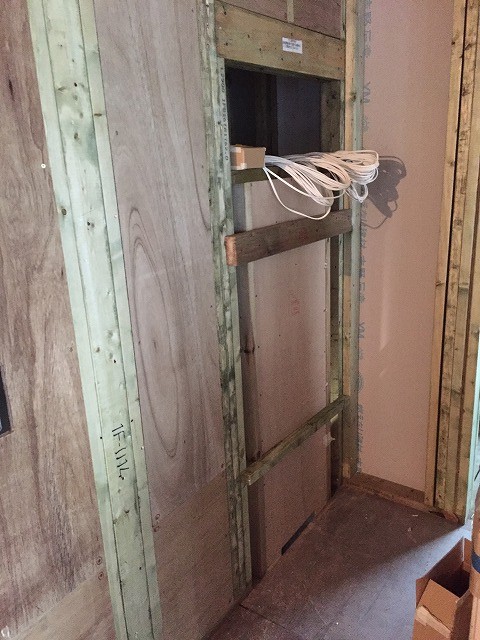 耐震のための壁の内部には電気が通せないため、このような木の構造物を取り付け、その上(手前)に配電盤を取り付けるそうです。